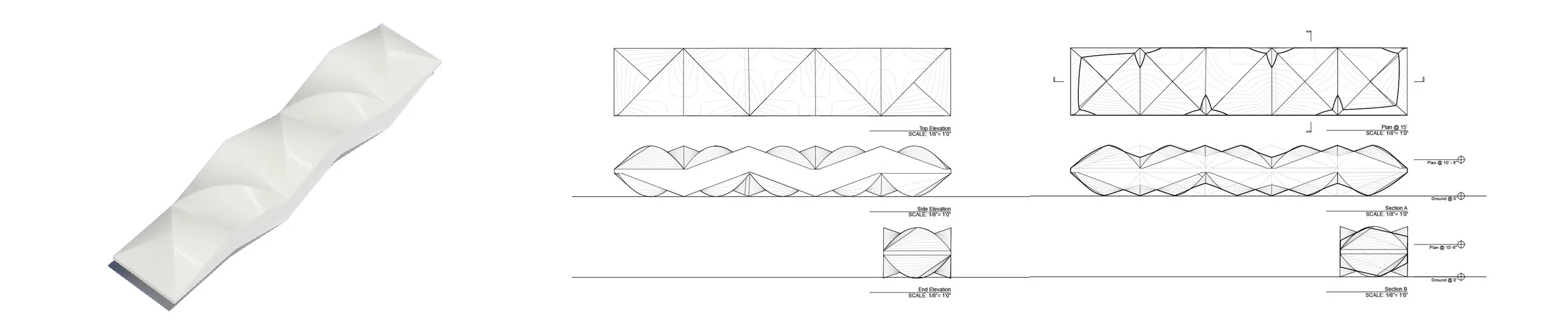 THE WAVES PROJECT ORIGINATED FROM A SEMESTER-LONG STUDY OF RECTANGULAR BLOCKS DEVELOPED FIRST BY HAND USING BASSWOOD WHICH LATER BECAME DIGITALIZED AND PRINTED USING A 3D PRINTER. THESE BLOCKS WERE THEN PUT INTO A SYSTEM TO CREATE AN OPEN MARKET FOR THE SUNSET BLVD AREA FOR THE COMMUNITY TO COME AND ENJOY.