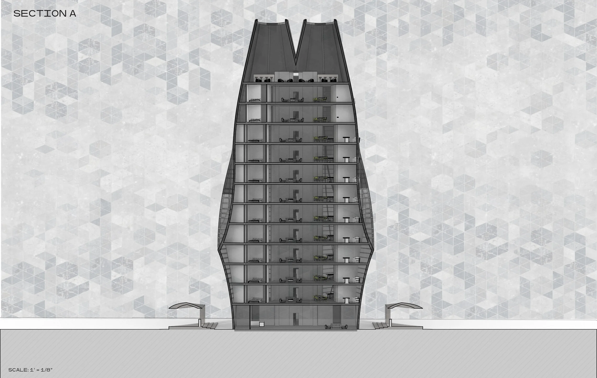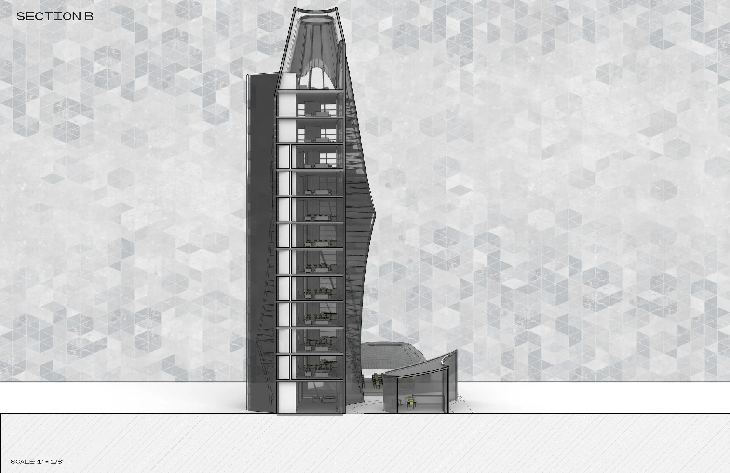 THE SKYTOWER PROJECT IS ONE WHICH AT THE BEGINNING OF THE SEMESTER STARTED OFF AS A NEST OF AN INSECT AND THEN TRANSITIONED INTO AN ADU. FOLLOWING THE ADU, THEN CAME THE EVOLUTION OF INTRODUCING MULTIPLE LIVING AREAS, WHERE THE IDEA OF A SKY TOWER CAME TO BE. THIS SKY TOWER HAS MULTIPLE FLOORS WHICH ALLOWS FOR 2 BEDROOM UNITS WITH MULTIPLE DIFFERENT DIMENSIONS AS THE TOWER GOES UP WITH NO FLOOR BEING LIKE THE ONE BEFORE.