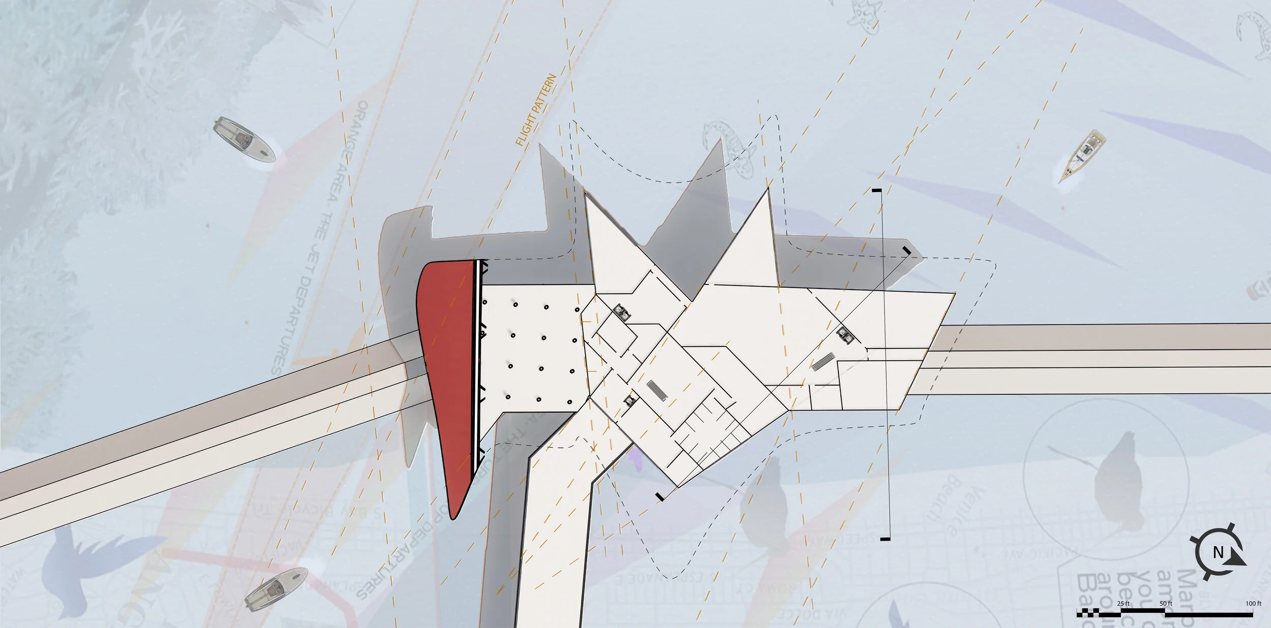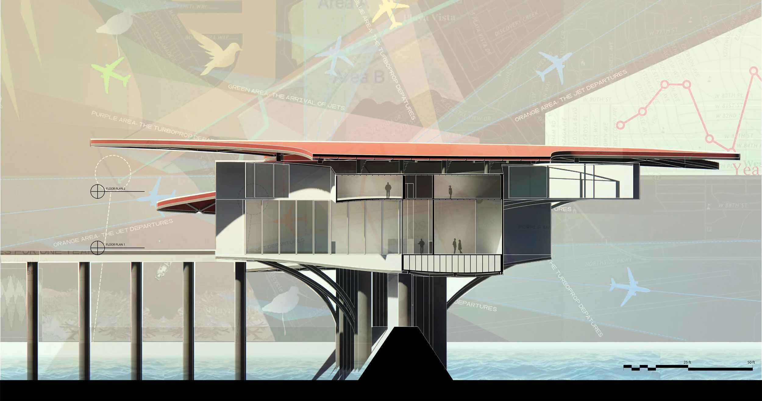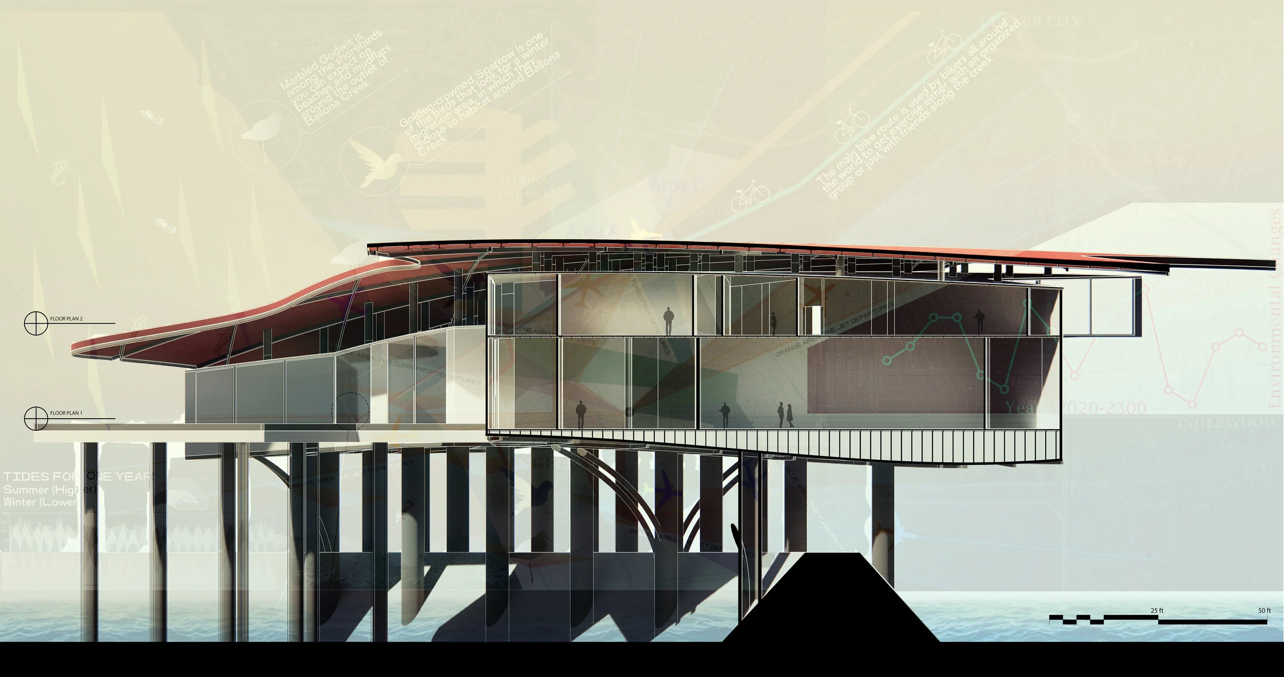WHAT STARTED OUT WITH A SITE AND BUILDING ANALYSIS OF AN EXISTING BUILDING RESULTED IN A BIRDWATCHING PLATFORM FOR PROJECT 1. THAT PROJECT ITSELF LEAD TO OUR MIDTERM/FINAL PROJECT WHICH FORMED INTO OUR FINAL PROPOSAL FOR BALLONA CREEK CALLED, THE AXILLARY FLIGHT & WAVES COMPLEX. THE A. F. W. C. HIGHLIGHTED THE ANGULAR FLIGHT PATTERNS WHICH GENERATED THE WALLS OF THE COMPLEX, AS WELL AS THE WAVES OF BALLONA CREEK WHICH GENERATED THE OVERALL CURVATURE AND LIFE OF THE BUILDING FROM THE ROOFS, TO THE CURVES ON THE BASE OF THE FLOORS.